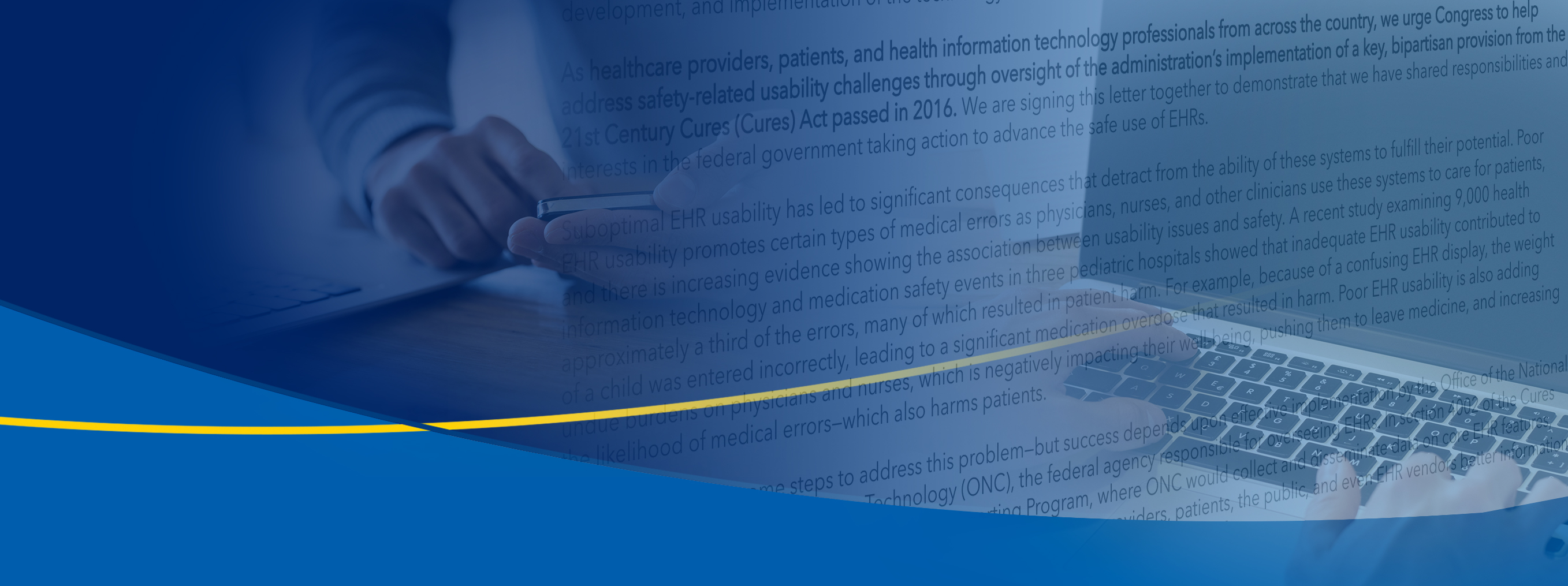 As healthcare providers, patients, and health information technology professionals from across the country, we urge Congress to help address safety-related usability challenges through oversight of the administration’s implementation of a key, bipartisan provision from the 21st Century Cures (Cures) Act passed in 2016. We are signing this letter together to demonstrate that we have shared responsibilities and interests in the federal government taking action to advance the safe use of EHRs.